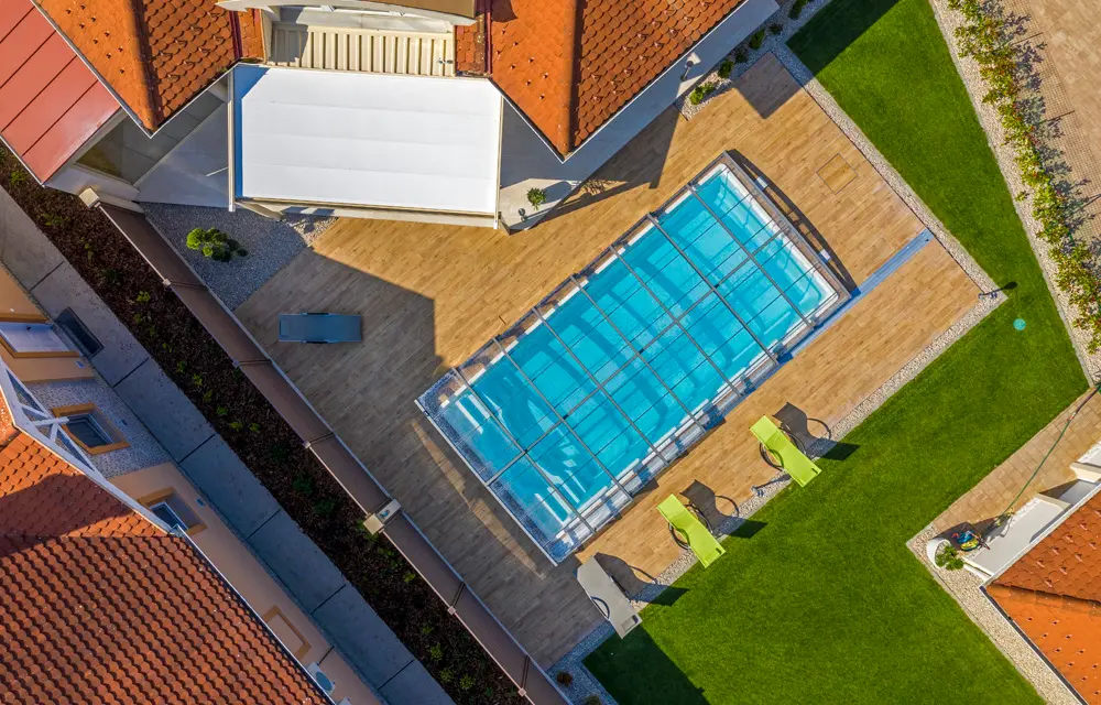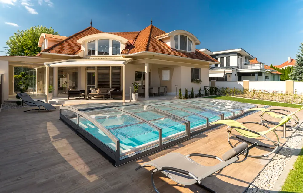 Les rails coulissants de cet abri facilitent l’ouverture et la fermeture, vous offrant ainsi la flexibilité de nager en plein air sous le soleil ou de vous abriter en quelques instants.